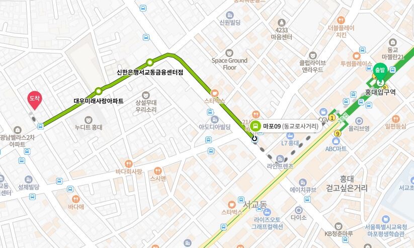 찾아오시는 길은 홍대입구역 1번 출구에서 나와 홍대입구 사거리에서 마을버스 9번을 타고 3번째 정류장 '해양전략연구소'에서 내리면 됩니니다.